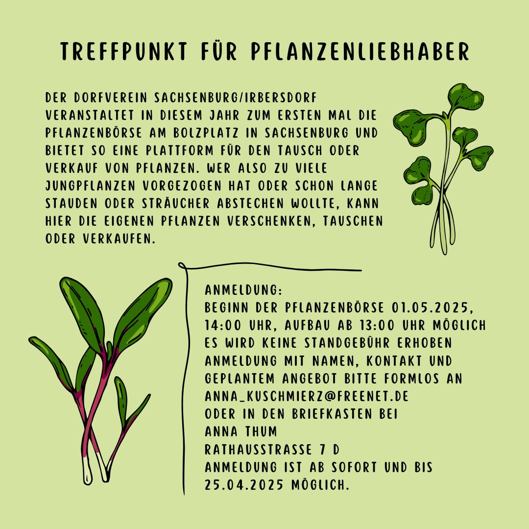 Am 1. Mai fand auf dem Bolzplatz in Sachsenburg unsere erste Pflanzenbörse statt. Viele Gartenfreunde nutzten die Gelegenheit, um Jungpflanzen, Stauden und Sträucher zu tauschen, zu verschenken oder zu verkaufen. In gemütlicher Runde entstanden dabei neue Kontakte, tolle Gespräche und jede Menge Lust aufs Gärtnern.